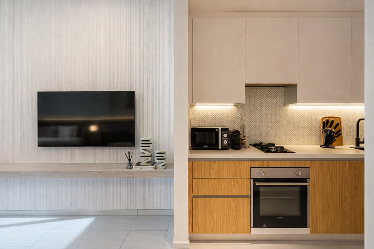 شقة أنيقة وواسعة بتصميم عصري، تضم غرفة نوم مريحة، وصالة مستقلة، ومطبخ مجهز بالكامل بأحدث الأجهزة. تتميز الشقة بإضاءة ذكية، وتكييف متكامل، وتشطيبات راقية توفر أقصى درجات الراحة. الموقع هادئ ومناسب للإقامة، مع توفر واي فاي سريع، سينما، وخدمة ذاتية على مدار 24/7، لتجربة سكن تجمع بين الخصوصية والراحة.